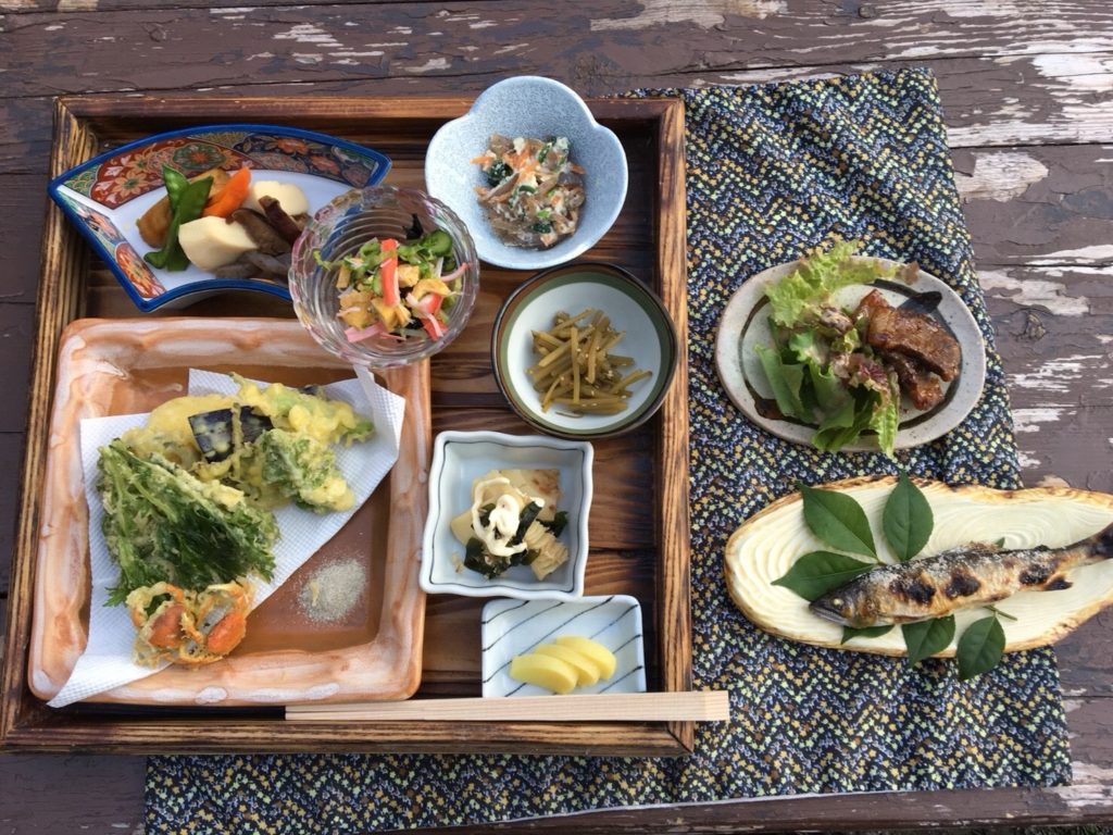 お昼に取った山菜・サワガニの天ぷら、ご近所の猟師さんが捕まえた猪のお肉、鮎とこれぞ山の幸のご馳走!!!
