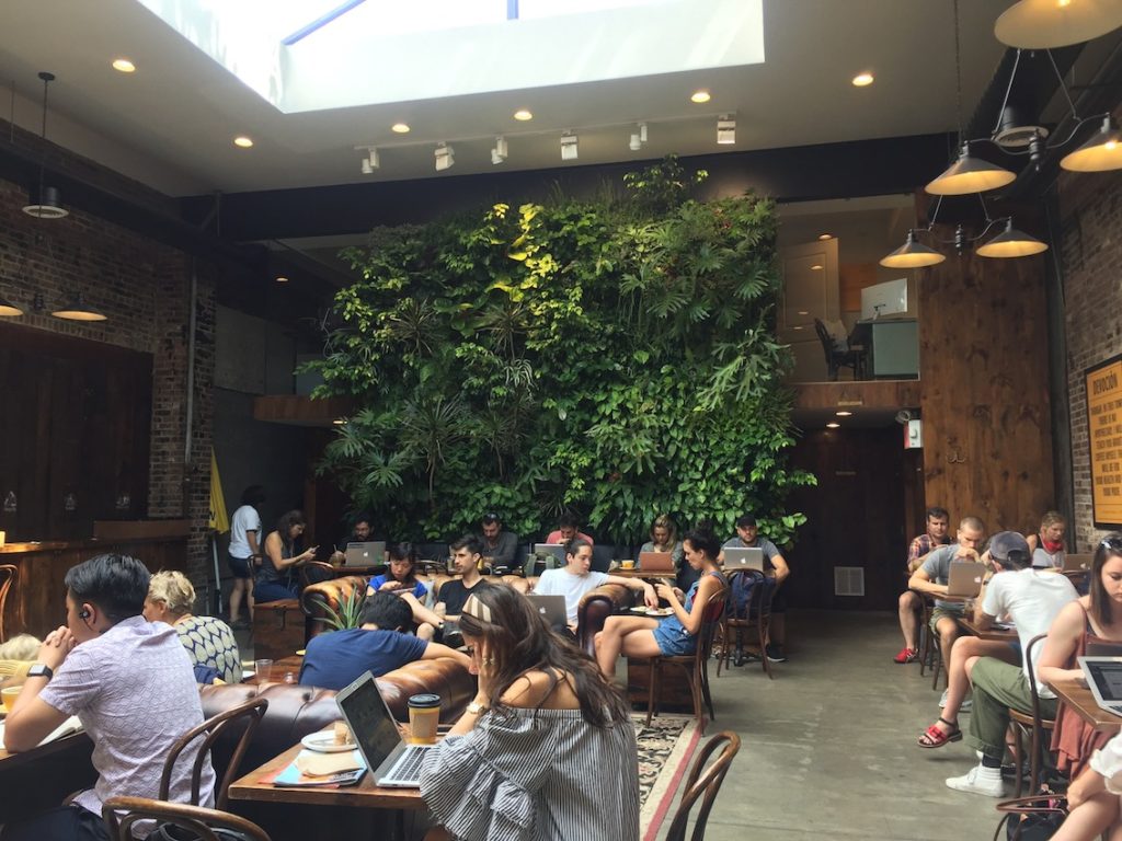高い天井で開放感があり、大きい天窓から差し込む光でカフェ全体が明るくて、大きいカウンターとバックにある壁掛け観葉植物とレンガ壁でインテリアもすごくまとまっていてメチャメチャかっこいい店内です!!!